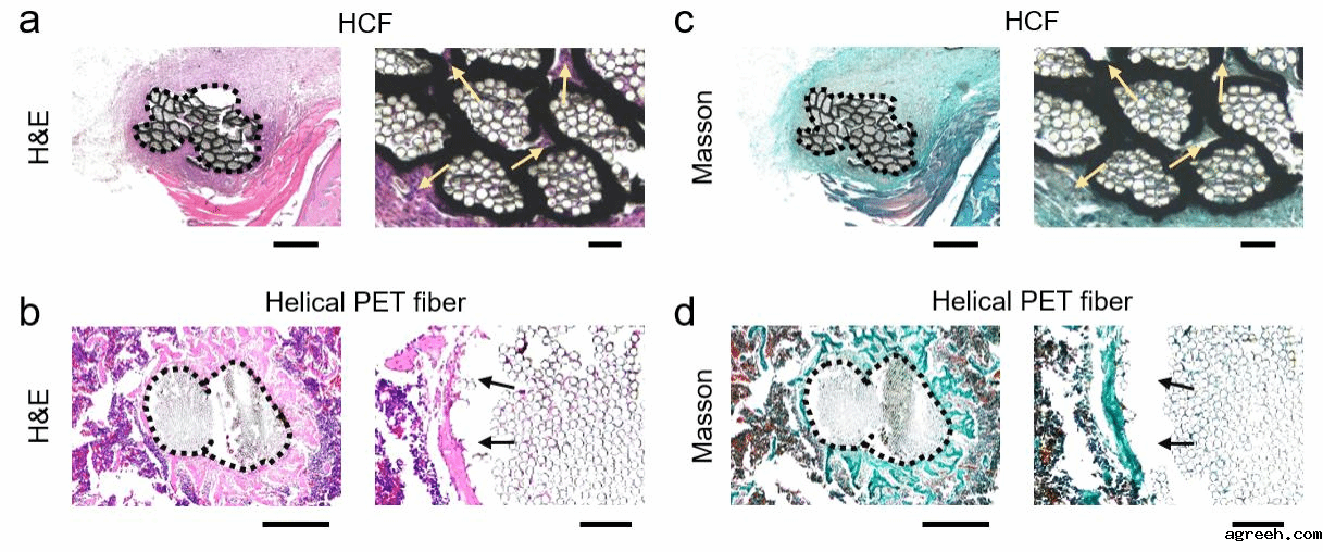 此外,组织学研究结果表明HCF具有优异的生物相容性和在体结构稳定性。同时,HCF的原料来源广泛,并采用工业上常见的包绕工艺进行制备,成本较低,易于实现连续化生产。这种多级螺旋组装的仿生策略可以为人工韧带临床问题提供新思路,具有良好的临床应用潜力。