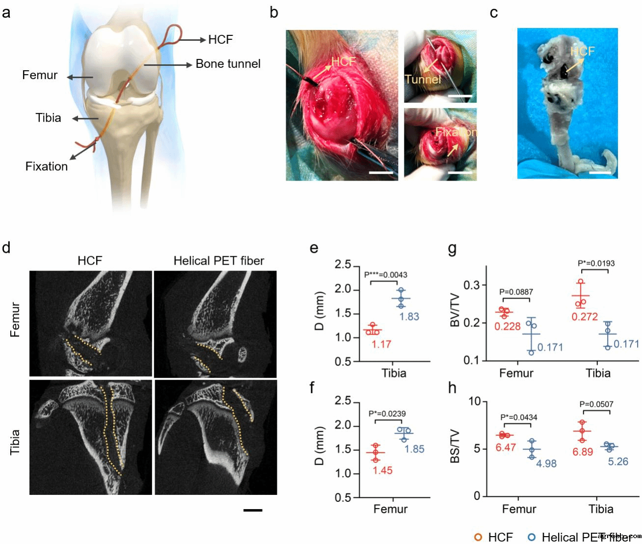 近日,研究院团队在上述工作基础上,进一步发展了一类兼具高性能和低成本的高分子/碳纳米管复合纤维人工韧带(HCF),其由作为芯层的商业PET纤维和作为鞘层的取向碳纳米管薄膜组成(图1)。与商业PET人工韧带不同,HCF具有独特的微纳米通道,可有效促进新骨生成和在体骨整合,无需其他细胞或生长因子的辅助。相关工作以“High-performance artificial ligament made from helical polyester fibers wrapped with aligned carbon nanotube sheets”为题发表在Advanced Healthcare Materials上。该研究获得国家科技部、国家自然科学基金、上海科委及其博士后基金等资助。